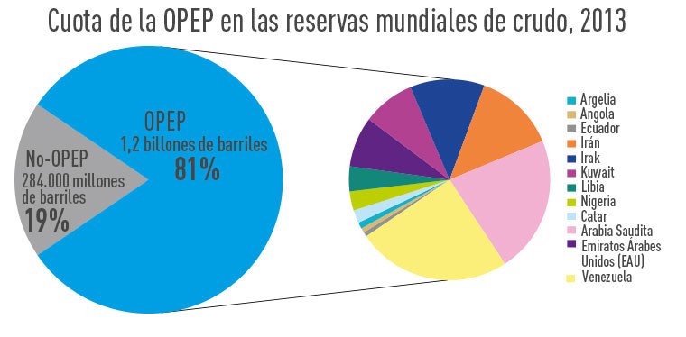 La OPEP concentra el 43% de la producción mundial de petróleo y su cuota de las reservas mundiales de crudo es del 81%.
