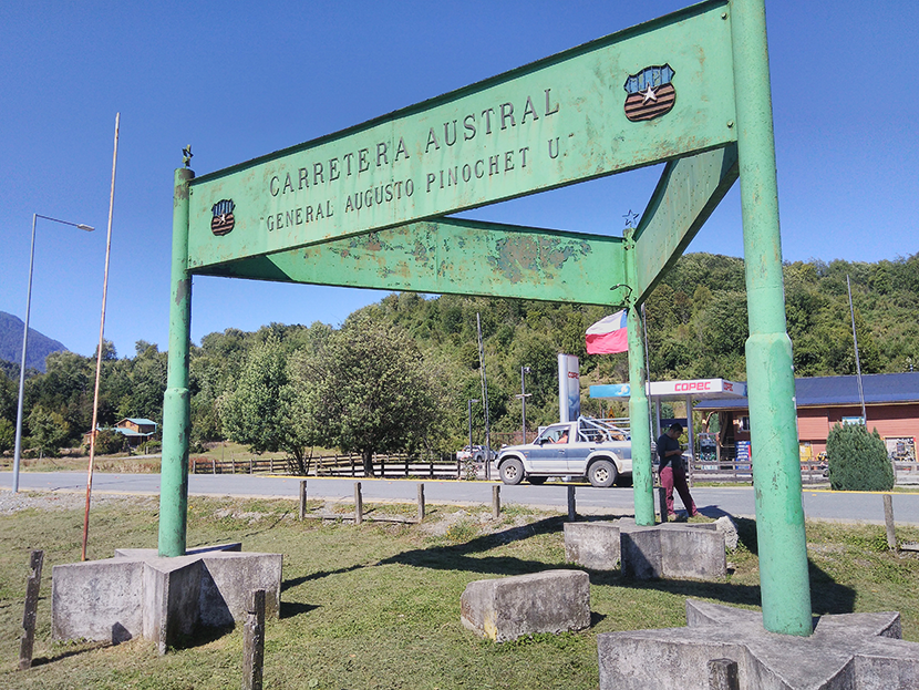 La Carretera Austral, la ruta que conecta casi toda la Patagonia chilena, luce semidesierta. Un auto se detiene cerca de un monumento al costado del camino, el conductor sale del vehículo, se para junto a la estructura y posa para la foto. Hace un saludo militar. Detrás suyo, puede leerse un nombre con grandes letras metálicas, que dicen: "General Augusto Pinochet U". Contento por obtener la imagen deseada, continúa su viaje.