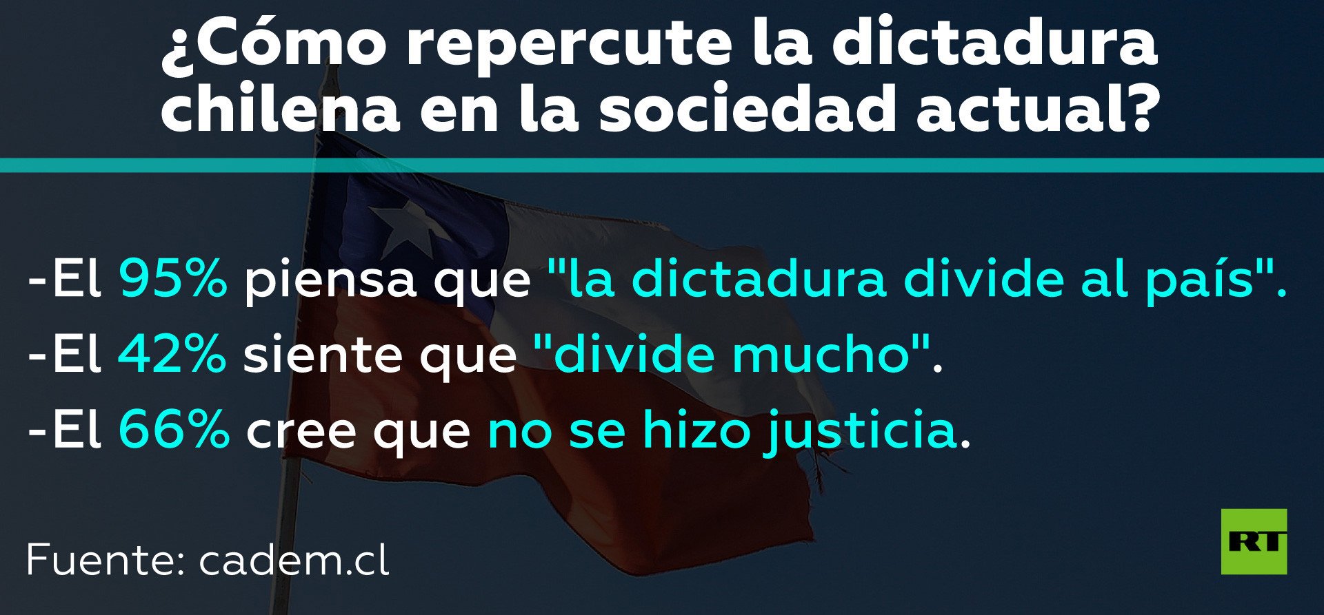 Más allá de opiniones puntuales, una encuesta de la consultora Cadem afirmó en septiembre del año pasado que el 95% de la población piensa que la dictadura sigue dividiendo al país, mientras que un 42% afirmó que "divide mucho". A su vez, el 66% de los consultados siente que no se hizo justicia en materia de derechos humanos, y el 85% cree que aún existen pactos de silencio entre antiguos militares involucrados en crímenes de lesa humanidad. Por otro lado, 27 de cada 100 chilenos piensan que otro golpe de Estado podría repetirse, 70 de ellos no lo ven posible y tres no lo saben. Ese mismo año, la Asociación Internacional para la Evaluación del Logro Educativo alertó que el 57% de los estudiantes del octavo año de la escuela básica aprobaría una dictadura si eso garantizara "orden y seguridad" en esa nación del Cono Sur.