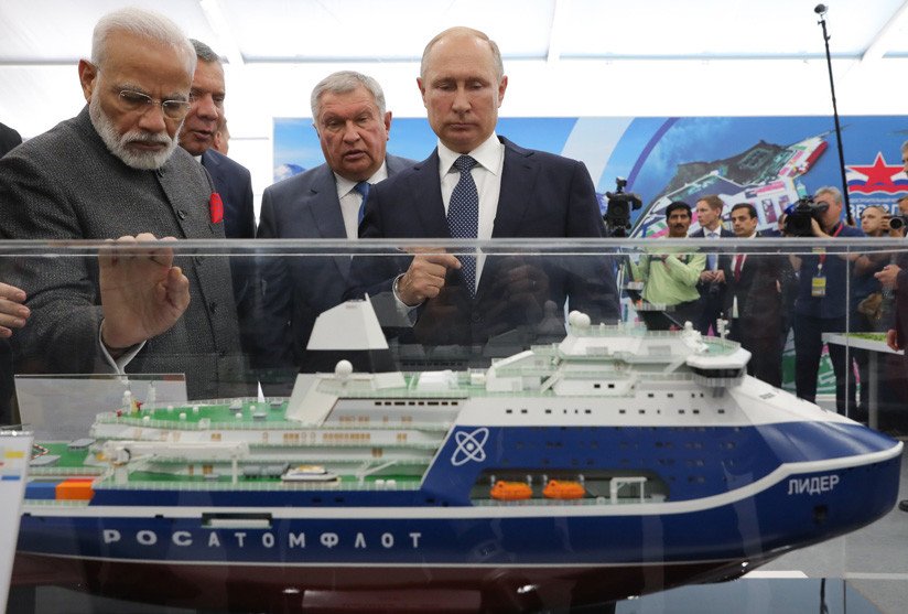 Concretamente, Putin llamó la atención del primer ministro de la India —mayor cliente de armeros rusos— en un modelo del mayor rompehielos del mundo. "Este es el rompehielos nuclear más grande del mundo. Esta nave podrá romper hielo de casi cualquier grosor: hasta de cuatro metros," precisó el jefe del Estado ruso.