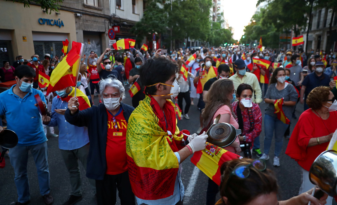 - El 13 de mayo, cuando la ciudadanía todavía estaba bajo un confinamiento severo para luchar contra la primera y devastadora ola de coronavirus en el país, salieron a la calle los vecinos de los barrios más acomodados de la capital. El alcalde de Madrid, José Luis Martínez-Almeida, las calificó de "protestas pacíficas" y dijo que, si se querían hacer, había que celebrarlas "cumpliendo el estado de alarma". La vicealcaldesa de la ciudad, Begoña Villacís, apuntó que le parecía bien "la protesta siempre y cuando" se hiciese "cumpliendo con las normas de seguridad". Los días siguientes se produjeron protestas similares.