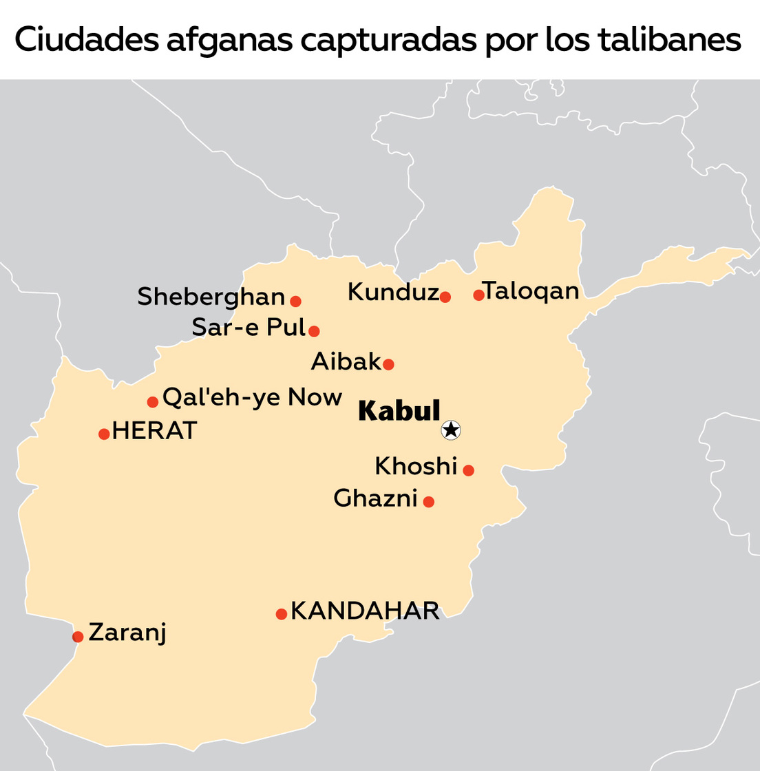 Un portavoz de los talibanes declaró este jueves que el movimiento político-paramilitar tomó el control de toda la ciudad de Kandahar, la segunda más grande de Afganistán y su principal centro de comercio, recoge el canal Al Arabiya. El movimiento anunció que también se apoderó del distrito de Khoshi, ubicado en la parte este de la provincia de Logar, a 80 kilómetros de la capital del país.