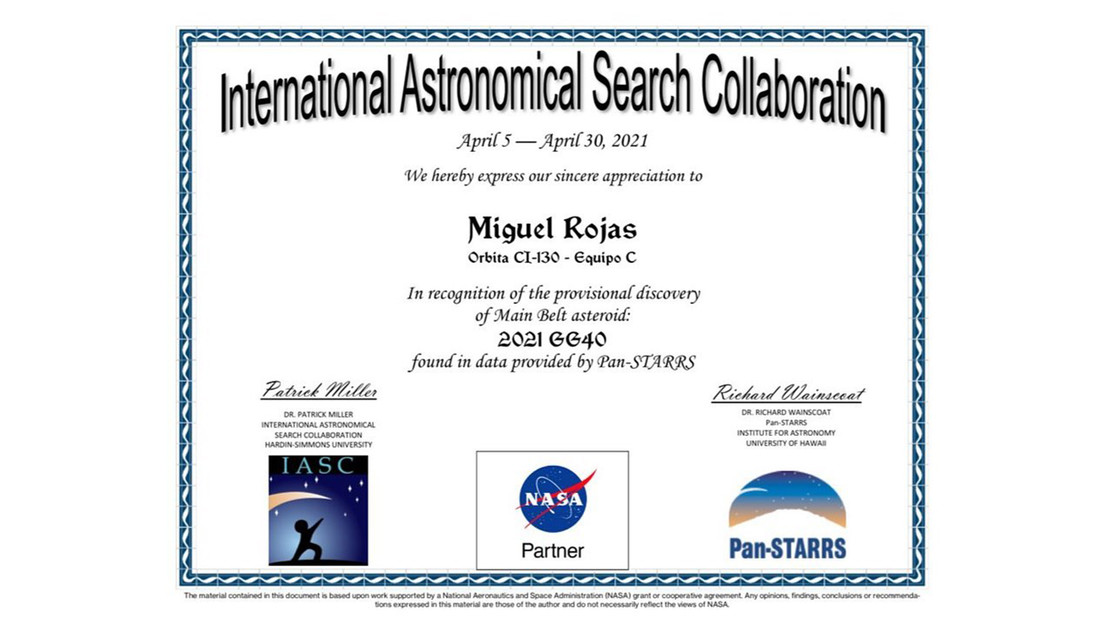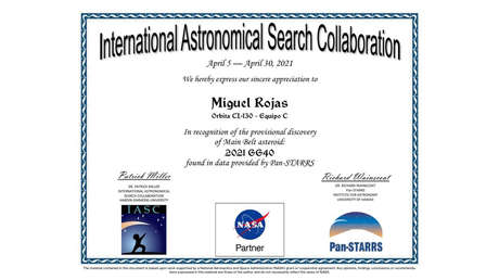 "Con mucha emoción, les comparto el reconocimiento que me ha hecho llegar la NASA, mi descubrimiento preliminar ahora es provisional, es decir, la NASA ya certificó que he descubierto un asteroide. Su nombre temporal es 2021GG40", explicó Miguel en una publicación que realizó en sus redes sociales.