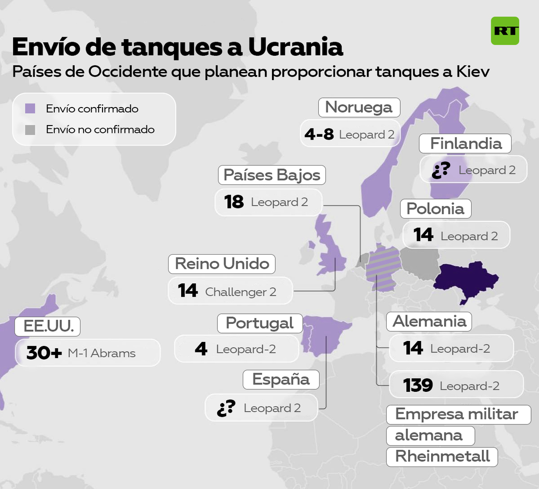 Luego de largas discusiones sobre la posibilidad de enviar tanques a Ucrania, varios países han anunciado en los últimos días su decisión de hacerlo. Las naciones de la UE prometieron el suministro de tanques alemanes Leopard, mientras que el Reino Unido y EE.UU. hablan de la entrega de tanques Challenger 2 y Abrams M1, respectivamente.