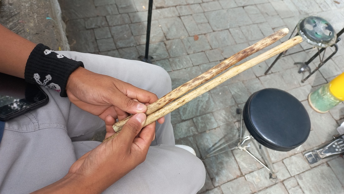 Entre sus dedos giraban las baquetas de la batería que él mismo fabricó con material reciclado y sin tener conocimiento alguno sobre cómo hacer ese instrumento compuesto por un conjunto de tambores y platillos que tiene más de cien años.