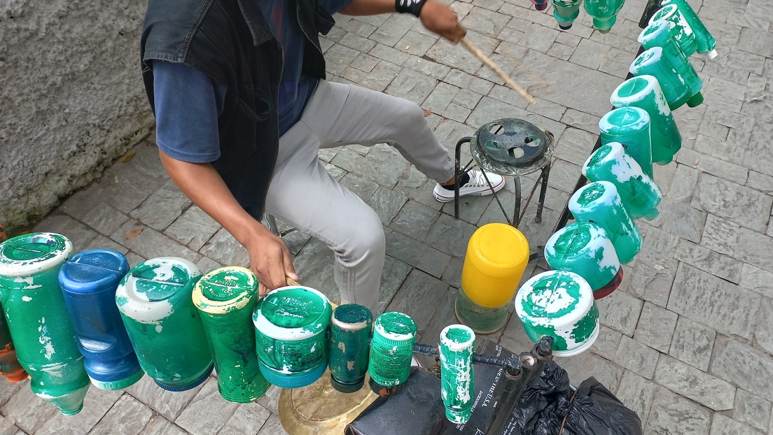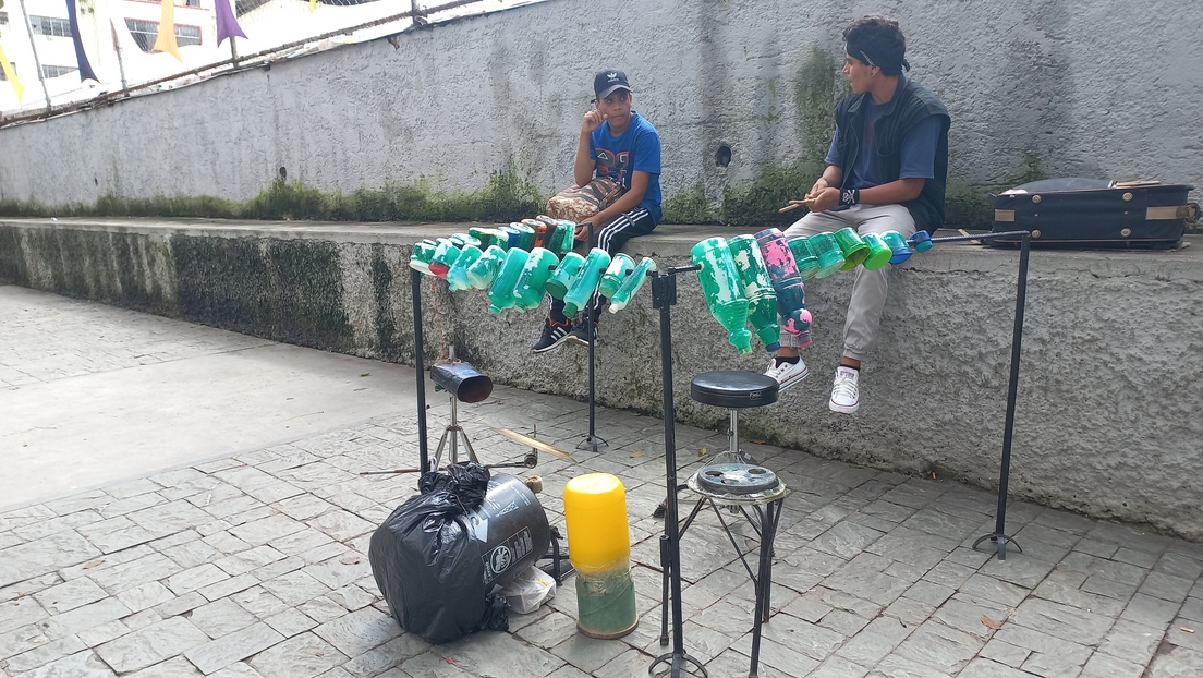 Los transeúntes se acercan, graban videos y lanzan algún billete a la gorra. Permanecen de pie, atentos, porque pareciera difícil de creer cómo puede salir un sonido producido por la percusión en una fila de envases.