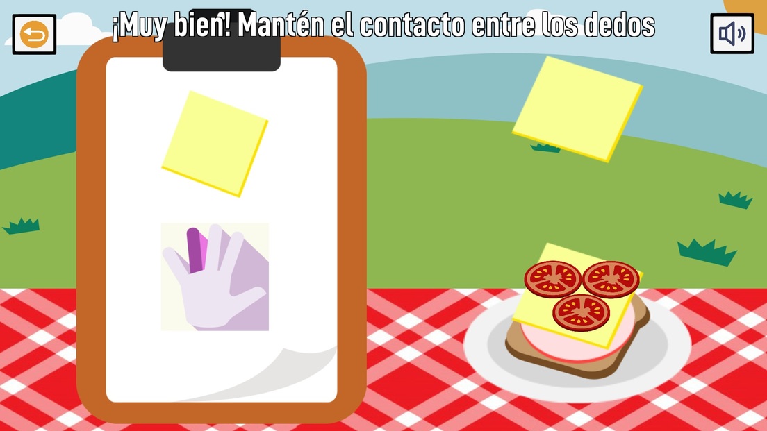 Con el uso del guante, en el juego 'Sandwichmanía', el paciente utilizará todos sus dedos: el índice representa el pan; el medio, el jamón; el anular, el queso; y el meñique, el jitomate. Cada dedo debe tocar el pulgar para armar los emparedados que se muestran en pantalla.