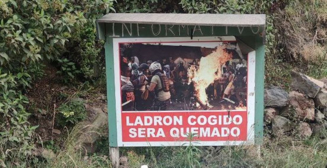 "Ladrón cogido será quemado", es la advertencia que se lee en un cartel apostado en el barrio Mulauco, en la parroquia Pifo del Distrito Metropolitano de Quito, en Ecuador.