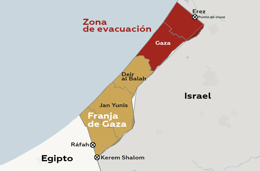 El viernes, el Ejército israelí ordenó a 1,1 millones de residentes del norte de la Franja de Gaza que se trasladaran al sur en un plazo de 24 horas. No obstante, tras el cierre de los cruces fronterizos por parte de Israel, los palestinos se quedaron sin posibilidad de abandonar la zona. Además, el único paso hacia Egipto, Ráfah, se cerró el martes luego de que los israelíes perpetraran ataques aéreos.