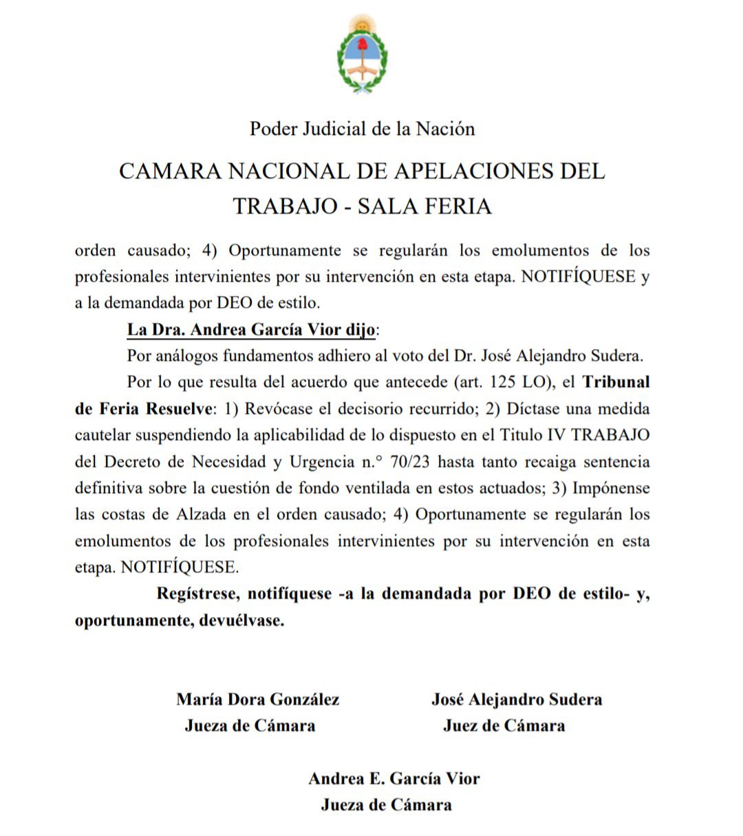 "Díctase una medida cautelar suspendiendo la aplicabilidad de lo dispuesto en el Titulo IV Trabajo del Decreto de Necesidad y Urgencia n.° 70/23 hasta tanto recaiga sentencia definitiva sobre la cuestión de fondo ventilada en estos actuados", se lee en la resolución, difundida por la agencia Télam.