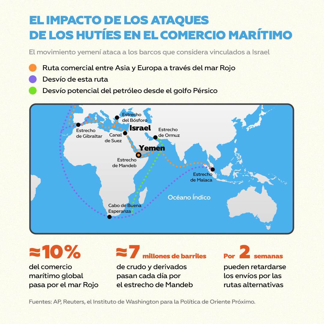 - El movimiento de los hutíes rebeldes Ansar Allah, declaró en noviembre la intención de atacar en el mar Rojo a cualquier barco que tenga bandera israelí, que sea de propiedad israelí o esté operado por empresas del país hebreo.