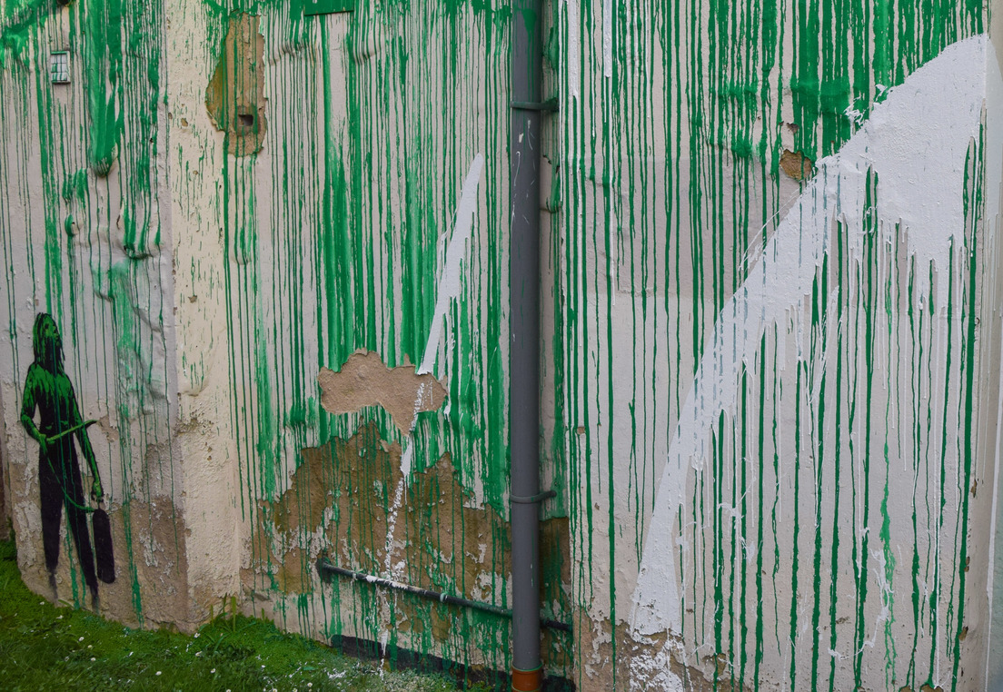 El mural apareció este lunes y está realizado con pintura del mismo color verde que utiliza el ayuntamiento de Islington para las señales de tráfico. Consiste en múltiples salpicaduras verticales de pintura verde que dan la impresión de ser el follaje de un árbol desnudo situado ante el edificio. En un rincón de la obra, una silueta de una persona sostiene la manguera a presión con la que representa se ha pintado la pared.