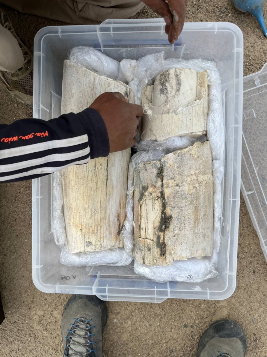 Durante una inspección, la semana pasada, se confirmó el hallazgo de un colmillo y fragmentos de mandíbula, separados por una distancia de unos 150 metros. Un barrido del área reveló una porción de hueso enterrado, que resultó ser la parte inferior del cráneo de un mamut. Los huesos expuestos se deterioran rápidamente bajo la luz solar, por lo que los arqueólogos trabajaron rápidamente para extraer y conservar lo que pudieron.