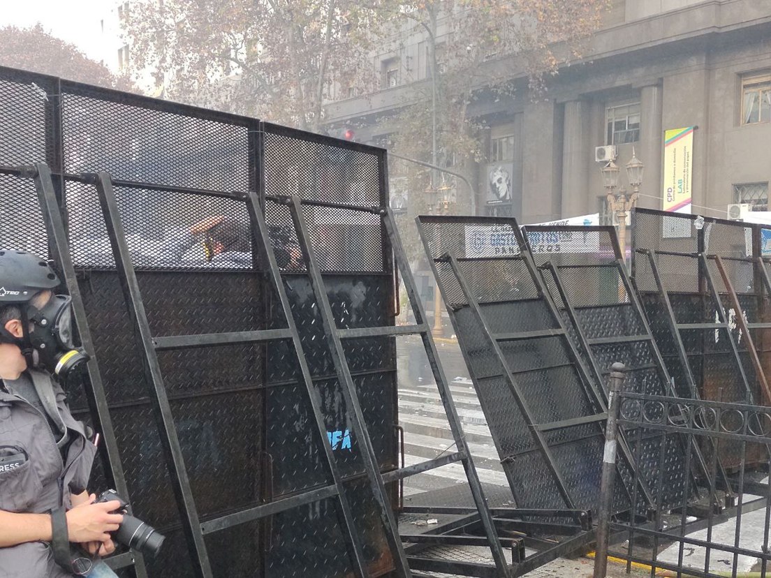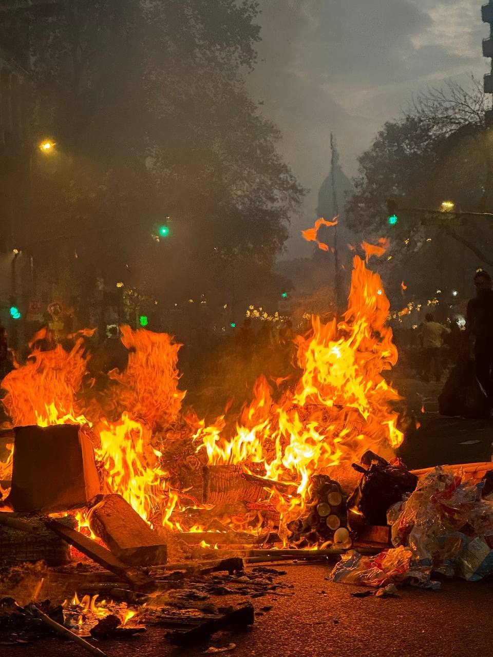 Las fuerzas del orden establecieron un cerco en torno a la sede del Congreso e intentaron repeler el avance de los manifestantes con gases lacrimógenos, balas de goma, cañones de agua y escudos, mientras algunas personas encendieron objetos para levantar barricadas.