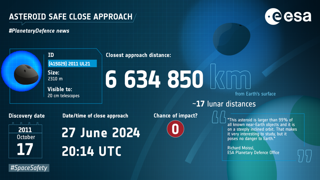 La Agencia Espacial Europea (ESA) comunicó este lunes que un enorme asteroide, denominado '2011 UL21', pasará este jueves a unos 6,6 millones de kilómetros de distancia de la Tierra, que es 17 veces la distancia a la que se encuentra Luna.