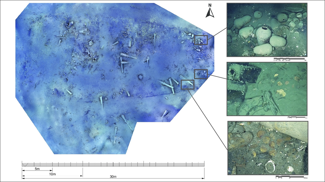 Las fotografías ilustran un nuevo estudio publicado en la revista Antiquity, y en ellas se distinguen decenas de monedas dispersas alrededor de la nave, así como armas y objetos de la vida cotidiana de la época.