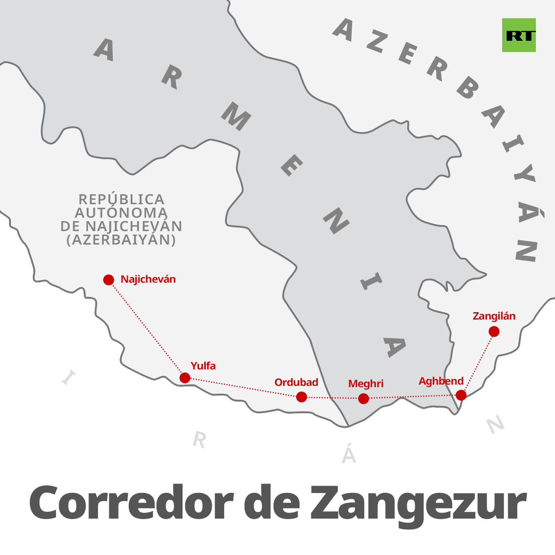 - El corredor que conecta las dos partes de Azerbaiyán atraviesa la región de Syunik, en el sur de Armenia, y se denomina corredor de Zangezur. Según los proyectos de Baku, esta ruta logística debe discurrir desde la ciudad de Najicheván hasta la ciudad de Zangelán y pasa justo al lado de la frontera con Irán. La longitud de la ruta es de 40 km.