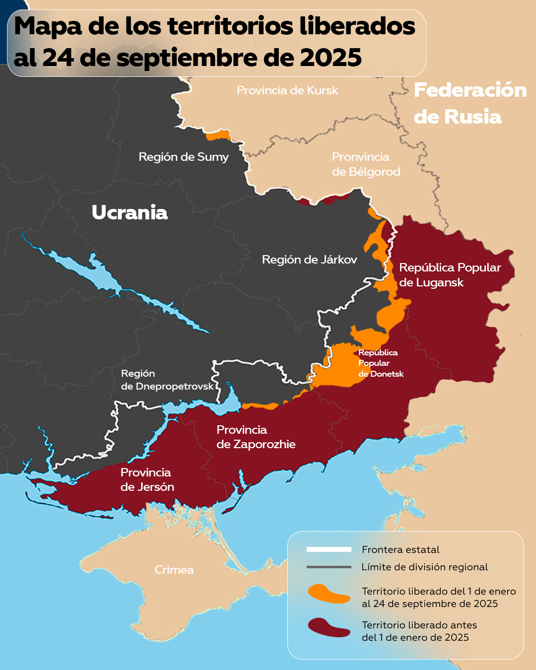 El ministerio destaca los avances de la agrupación Este del Ejército ruso, que continuó su ofensiva hacia las defensas del enemigo y liberó el poblado de Stepovoye en la región de Dnepropetrovsk. A su vez, unidades de la agrupación Oeste liberaron el poblado de Derílovo en la República Popular de Donetsk. Otro poblado, Máiskoye, en la misma región, fue liberado por las tropas de la agrupación Sur.