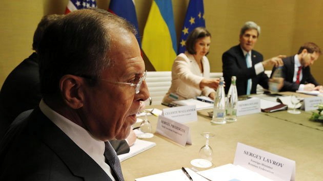 Jim Bourg / REUTERS Gracias a los esfuerzos de la diplomacia rusa, Rusia, EE.UU., la UE y Ucrania acordaron en la reunión a cuatro bandas celebrada en Ginebra la hoja de ruta para rebajar el conflicto ucraniano propuesta por Moscú que supone, ante todo, la amnistía a los manifestantes quienes no hayan cometido crímenes graves, el desarme de todos los grupos armados en Ucrania y la devolución de los edificios ocupados ilegalmente a sus legítimos propietarios.