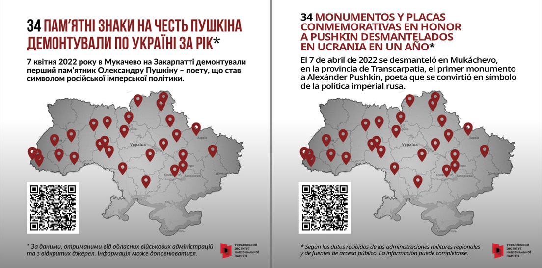 Además de la exitosa demolición de monumentos de Pushkin, el Instituto de la Memoria se jacta en su informe anual de la destrucción de nueve monumentos al escritor soviético Máximo Gorki, cuatro monumentos al autor de 'Cómo se templó el acero', Nikolái Ostrovski, quien resultó ser un ucraniano incorrecto, cuatro monumentos al gran estratega y héroe militar ruso del siglo XVIII Alexánder Suvorov y cerca de veinte memoriales y monumentos dedicados a los soldados soviéticos que liberaron a Ucrania del fascismo hitleriano. Como una hazaña especial y "un ejemplo de la descolonización del espacio público", se menciona el desmontaje del monumento en Odesa a la emperatriz rusa Catalina, quien fuera la fundadora de esta ciudad portuaria en 1794, cuando la palabra "Ucrania" se usaba solo para definir las tierras fronterizas en el sur del Imperio Ruso.