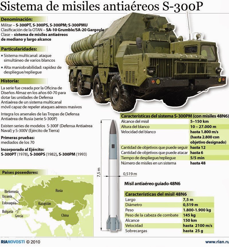 De acuerdo con el portal Aif.ru, el sistema antiaéreo S-300 está diseñado para neutralizar aviones, misiles de crucero, misiles balísticos y otros blancos que vuelan a velocidades de hasta 1.200 m/s a unas alturas desde 25 metros.