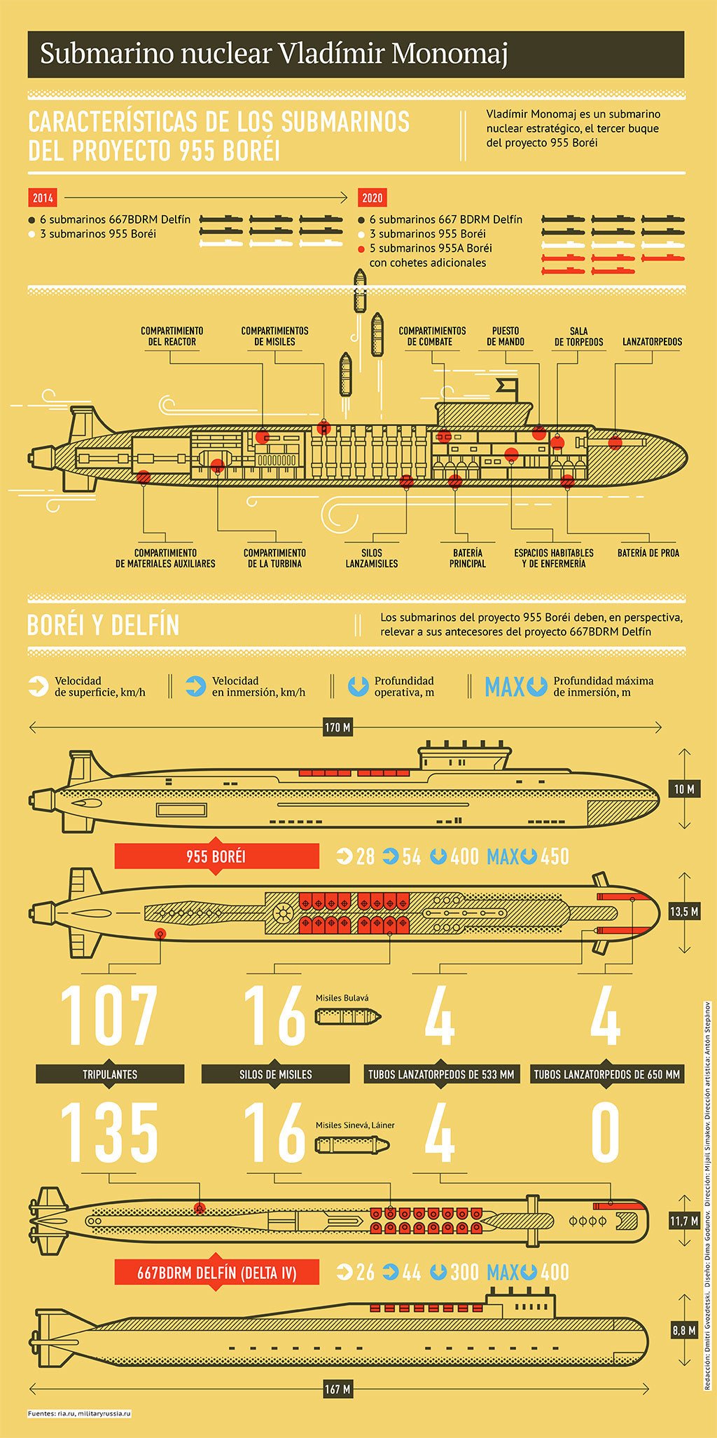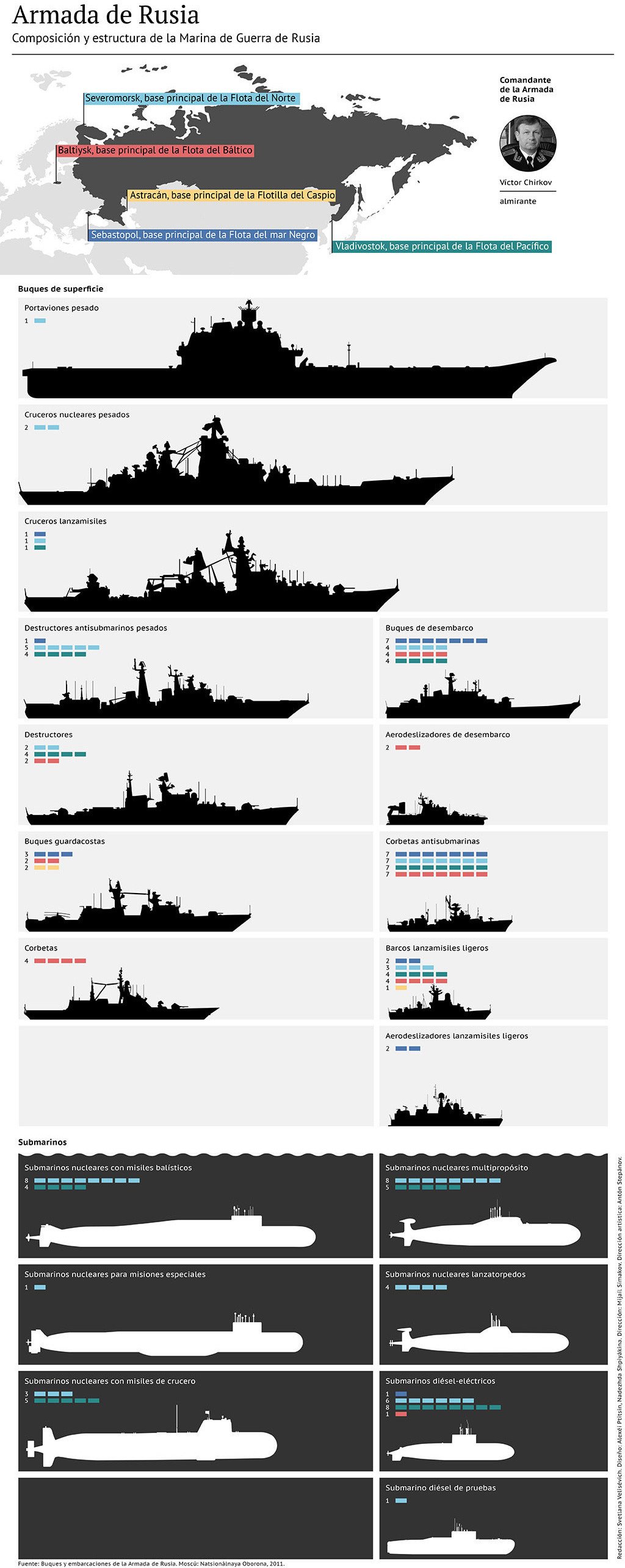 Actualmente, la Armada de Rusia cuenta con 60 submarinos nucleares, una decena de los cuales son estratégicos y más de 30 son de ataque; el resto son diésel y otros sirven para propósitos especiales.