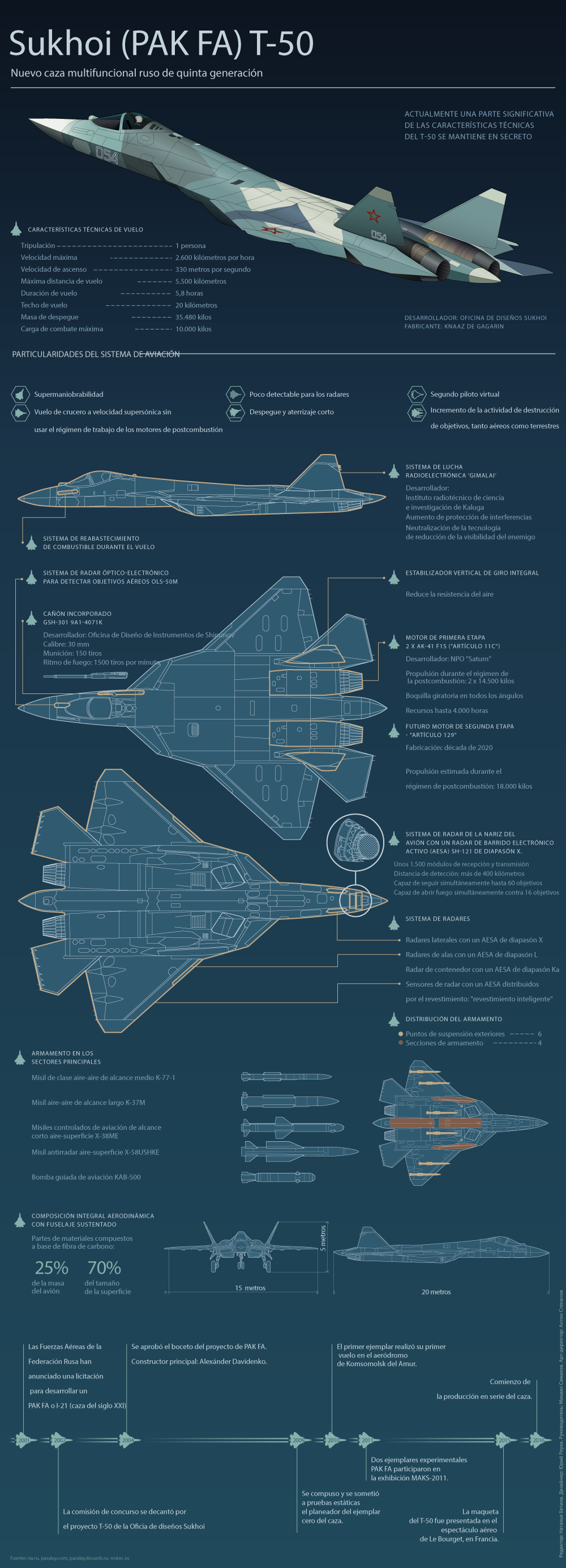Información general: Gran parte de la información sobre el T-50 aún se mantiene clasificada. Por esta razón se conocen solo las características aproximadas de la aeronave. Por sus características de tamaño y peso de despegue corresponde a un caza multifuncional pesado, análogo al Su-27 ruso o a los F-15 o F-22 estadounidenses.
