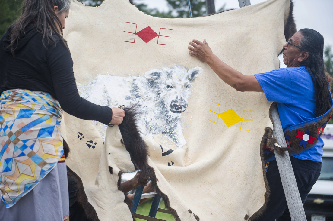 Según una leyenda de la tribu lakota, hace unos 2.000 años, cuando llegaron tiempos difíciles, se acabó la comida y los bisontes desaparecieron. Entonces llegó la Mujer Becerro Búfalo Blanco y le dio su pipa a la tribu, enseñó a sus miembros a rezar y les prometió que, si encendían la pipa, los animales regresarían y todo mejoraría. Dicho esto, se fue, convirtiéndose en una ternera de bisonte blanco.